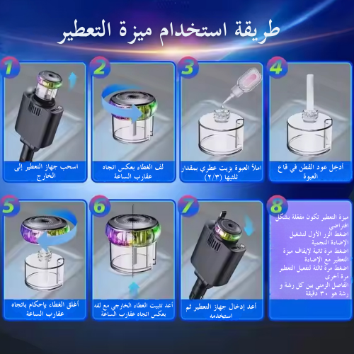 بخاخ تعطير مدمج ينشر رائحة فاخرة خلال ثوانٍ، مع إضاءة نجمية تضيف مزاج هادي وراقي وقت الليل
